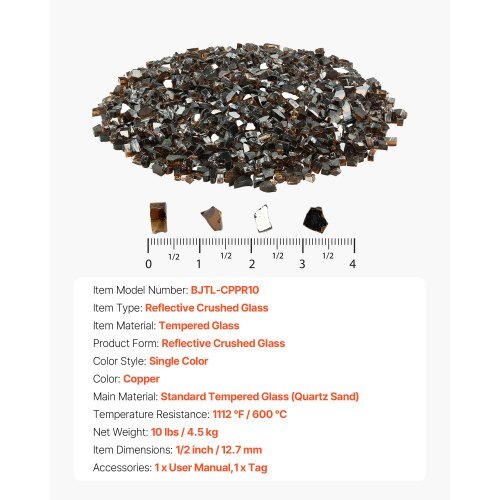 VEVOR Fire Glass, 10 LBS / 4.5 KG High-Temperature ResistantFireplace Rocks, 1/2-Inch / 12.7 mm Reflective & Smokeless FirepitGlass Rock, High Luster Stone Landscaping for Fire Pit Table,Copper Ideal Decoration High-Temperature Firepit Glass Easy to Clean Purchase Guide Versatile Style No Smoke or Odor Product Form: Reflective Crushed Glass,Item Material: TemperedGlass,Color: Red Brown Copper,Item Model Number:BJTL-CPPR10,Temperature Resistance: 1112 ℉ / 600 ℃,Color Style:Single Color,Item Dimensions: 1/2 inch / 12.7 mm,Item Type:Reflective Crushed Glass,Net Weight: 10 lbs / 4.5 kg,Main Material:Standard Tempered Glass (Quartz Sand) SHIP FROM : USA SHIP TO : USA
