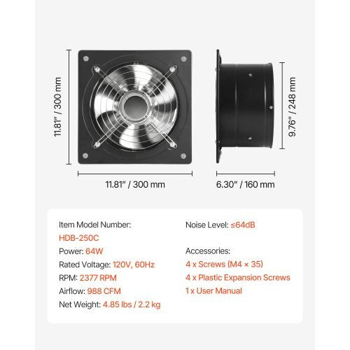 Product condition: New VEVOR 10 Inch Exhaust Fan, 988 CFM High Velocity Wall Mount VentFan with On/Off Control, Low Consumption, Portable VentilationExtractor for Attic,Garage,Basement,Workshop,Kitchen, ChickenCoop,Black Wall-Mount Exhaust Fan Powerful Ventilation Efficiency Convenient Design Easy Installation Wide Application Easy Operate Airflow: 988 CFM,Noise Level: ≤64dB,Air Speed: 5.8 m/s,Item ModelNumber: HDB-250C,Net Weight: 4.85 lbs / 2.2 kg,Power: 64W,RPM: 2377RPM,Rated Voltage: 120V, 60Hz,Product Size: 11.81 x 11.81 x 6.30 in/ 300 x 300 x 160 mm SHIP FROM : USA SHIP TO : USA