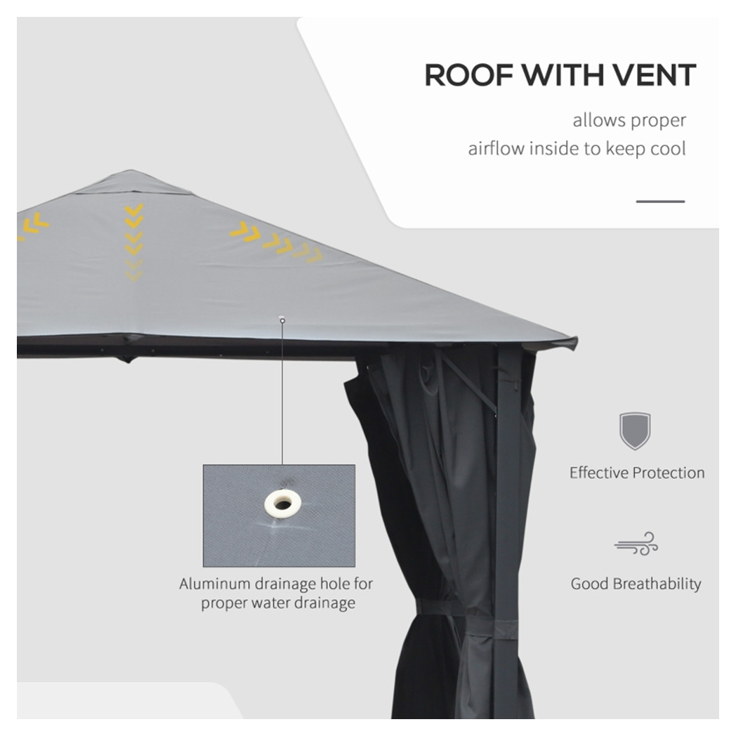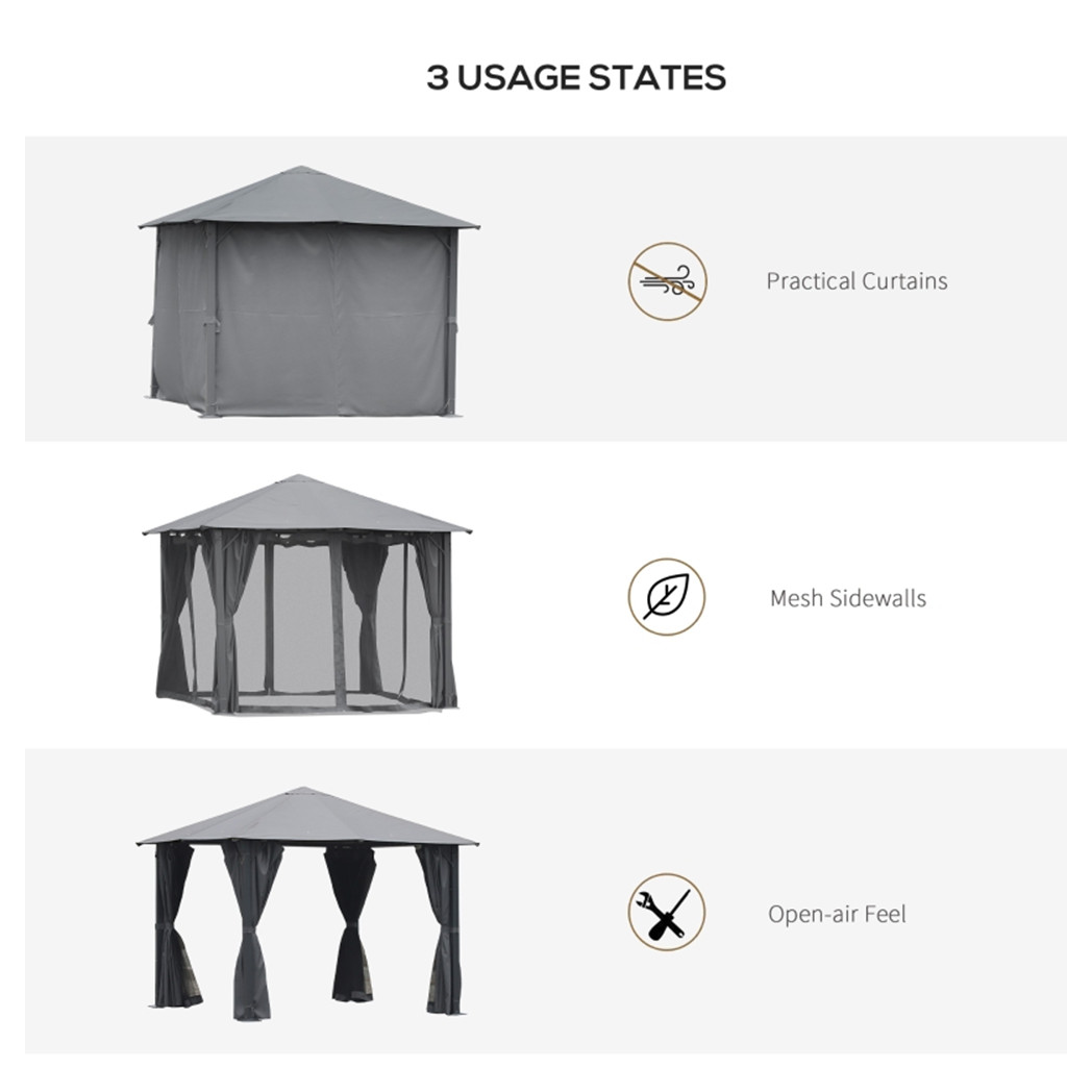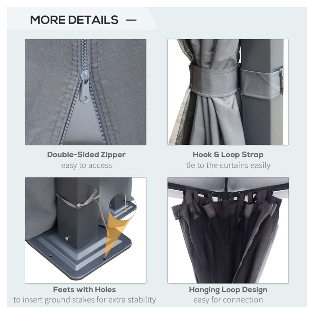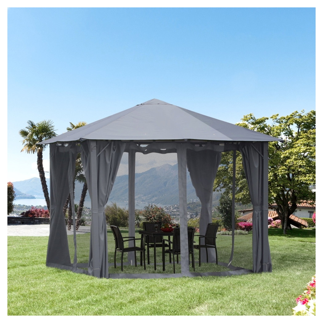 - Mesh netting to avoid winged fiends, and curtain sidewalls to stop wind, glare, and allow privacy
